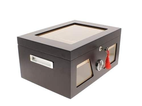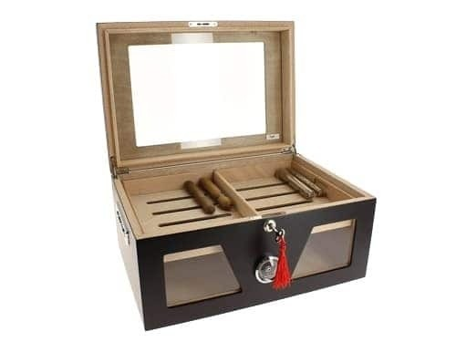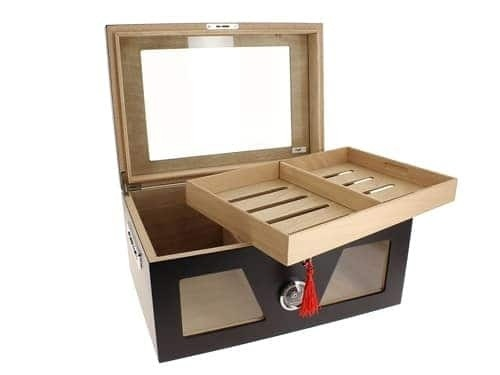 Cette cave est vitrée sur le dessus et possède 2 fenêtres en façade afin de voir tous les cigares, sans ouvrir la cave.