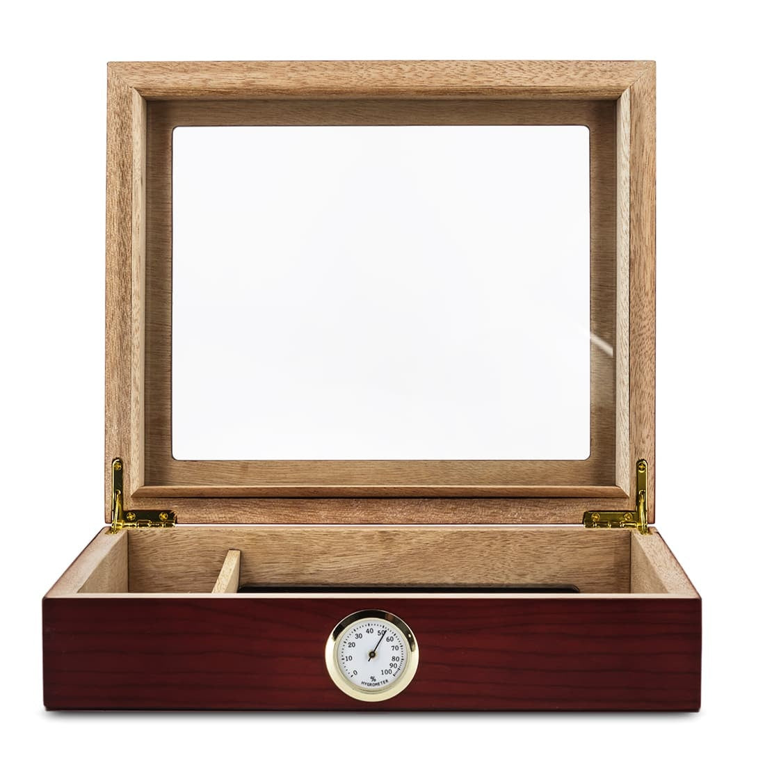 Petite cave à cigare de couleur acajou, vitrée sur sa face supérieure.